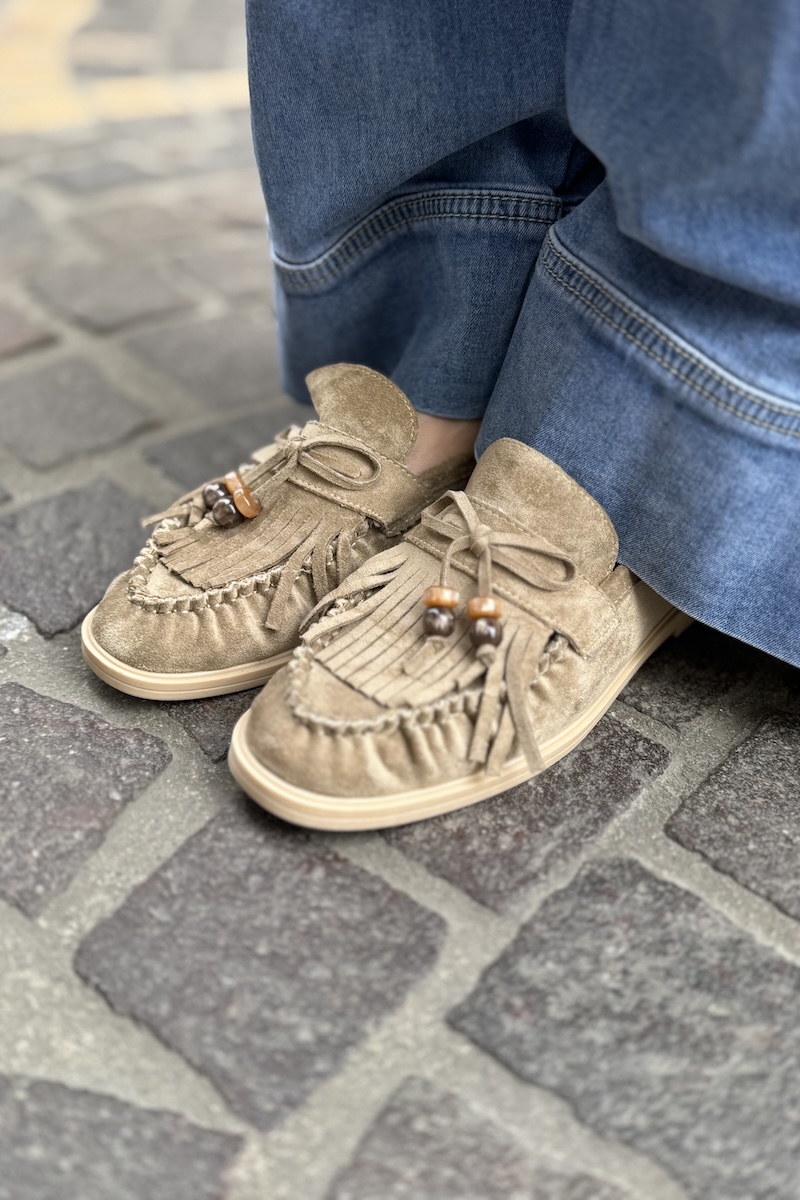 Mocassins en suédine avec franges et nœud.