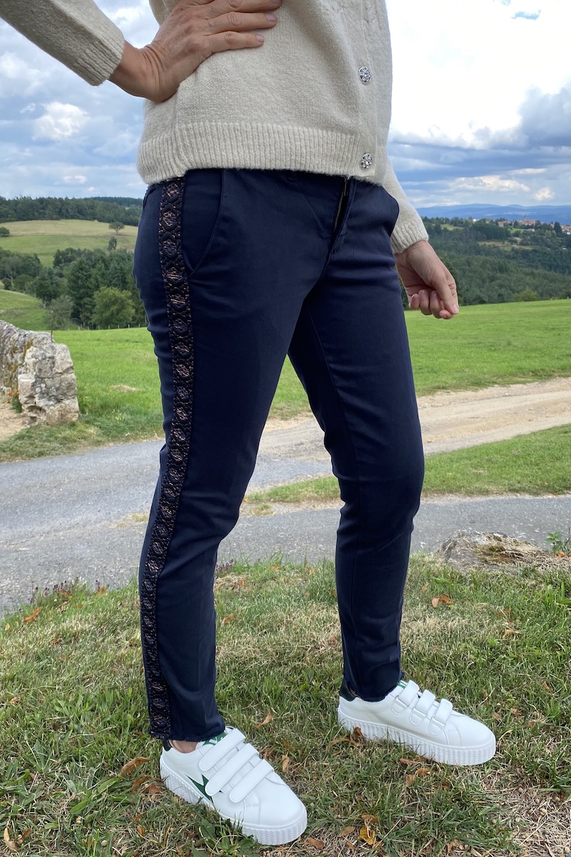 Détail bande brodés et incrustés de fils lurex sur les 2 cotés de la jambe